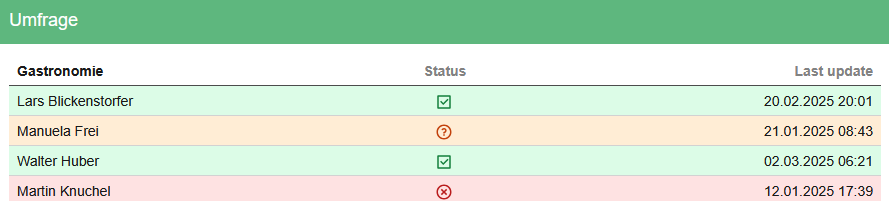 Eine zweite Verbesserung betriff das Zusammenspiel von Anlassplanung und Personalumfrage. Ihr könnt jetzt direkt aus dem Anlass heraus (im Abschnitt Personal) auf die aktuellen Umfrageergebnisse zugreifen. Oben links im schwarzen Balken: