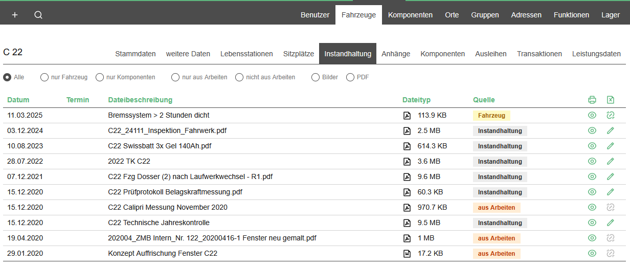 Dabei konnte der Programmierer Rafael Egli ein weiteres, schönes Hilfsmittel einbauen. Wir sind jetzt schon seit knapp 6 Jahren mit der Drehscheibe unterwegs. In dieser Zeit haben die Anwender sehr viele RepZettel / Instandhaltungsaufträge erstellt und abgeschlossen. Im RezpZettel wird ja gespeichert, warum oder was erledigt worden ist. Somit können wir jetzt bei den Fahrzeugen und Komponenten alle ausgeführten Arbeiten der Vergangenheit auch anzeigen:
