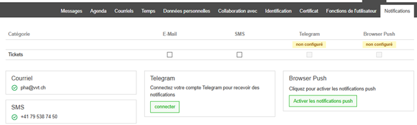 Dans son compte, chaque utilisateur peut indiquer via quels canaux de communication il souhaite recevoir les messages, soit via E-mail, SMS, Telegram ou Web-Push (avis directs dans le Browser activé).